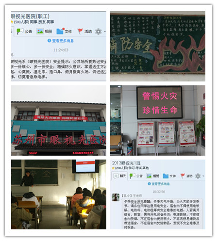 11月中旬起,眼視光系(眼視光醫(yī)院)著力營造消防安全月活動(dòng)氛圍。眼視光系通過櫥窗、板報(bào)、主題班會(huì)、QQ群等,組織全系學(xué)生學(xué)習(xí)消防知識,觀看消防安全教育片,提高廣大師生的消防安全意識和逃生自救能力,組織學(xué)生參加書院校區(qū)舉辦的消防知識競賽,取得團(tuán)體二等獎(jiǎng)的好成績。并利用醫(yī)院短信平臺(tái),向全系(院)職工發(fā)送溫馨的消防安全提示,提醒廣大職工增強(qiáng)消防安全意識。眼視光醫(yī)院在醒目位置,張掛消防安全宣傳橫幅:“消除火災(zāi)隱患,構(gòu)建和諧社會(huì)”,在醫(yī)院大廳設(shè)置消防宣傳展板、無煙醫(yī)院展板,一樓大廳電子屏滾動(dòng)播放消防安全標(biāo)語:“警惕火災(zāi),珍惜生命”。