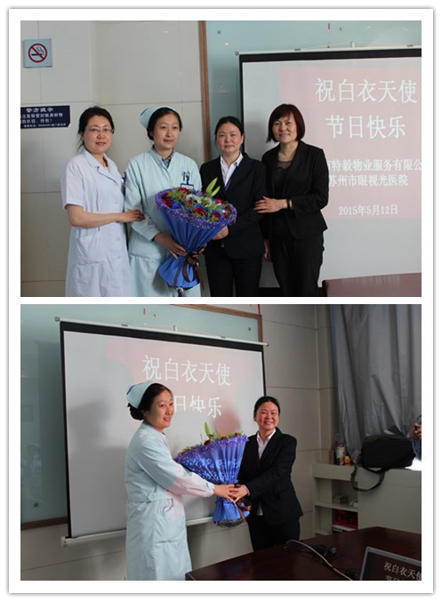 在5-12國際護士節(jié)來臨之際,蘇州市特毅物業(yè)服務有限公司一行四人來到蘇州市眼視光醫(yī)院向辛勤工作在一線的護士們送上節(jié)日的祝福。他們對廣大護士長期以來救死扶傷、任勞任怨、甘于奉獻的高尚精神給予了高度的評價,感謝白衣天使們的辛勤勞動和無私奉獻。黨總支書記丁旭紅、副院長賈松、護理部護士長陳娟及護士代表參加活動。
