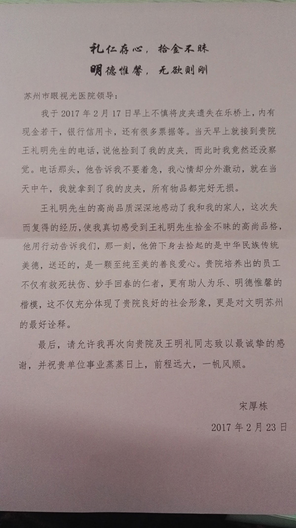 ——蘇州市眼視光醫(yī)院收到一封拾金不昧的感謝信