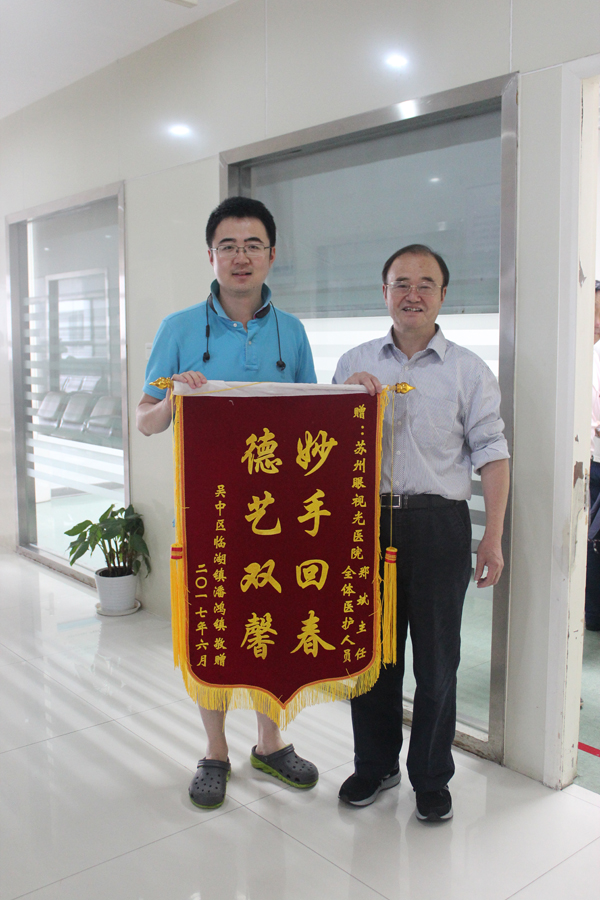 近日蘇城進(jìn)入梅雨季,陰雨連綿,路上行人也甚是稀少,而6月22日早上,71歲的潘先生特意冒雨趕到蘇州市眼視光醫(yī)院送來錦旗,以此表達(dá)他對(duì)鄭斌主任的謝意。