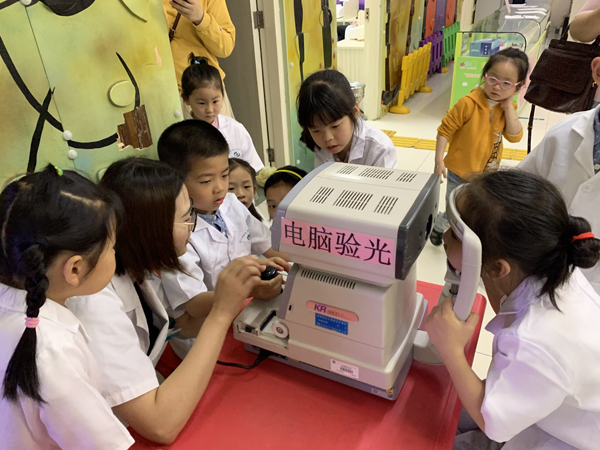 活動(dòng)首先帶領(lǐng)小朋友們參觀醫(yī)院的診療環(huán)境。大家來(lái)到了醫(yī)院的分診臺(tái)、視光門診、眼鏡柜臺(tái)、眼鏡加工室,通過(guò)工作人員的講解,了解了視光門診就診的流程,以及醫(yī)院各個(gè)部門的分工及配合情況。接著,小朋友們體驗(yàn)了視力檢查和電腦驗(yàn)光檢查,在醫(yī)務(wù)人員的指導(dǎo)下,小朋友們還饒有興趣地做了一次“小醫(yī)生”,嘗試著給家長(zhǎng)們檢查視力、做電腦驗(yàn)光。