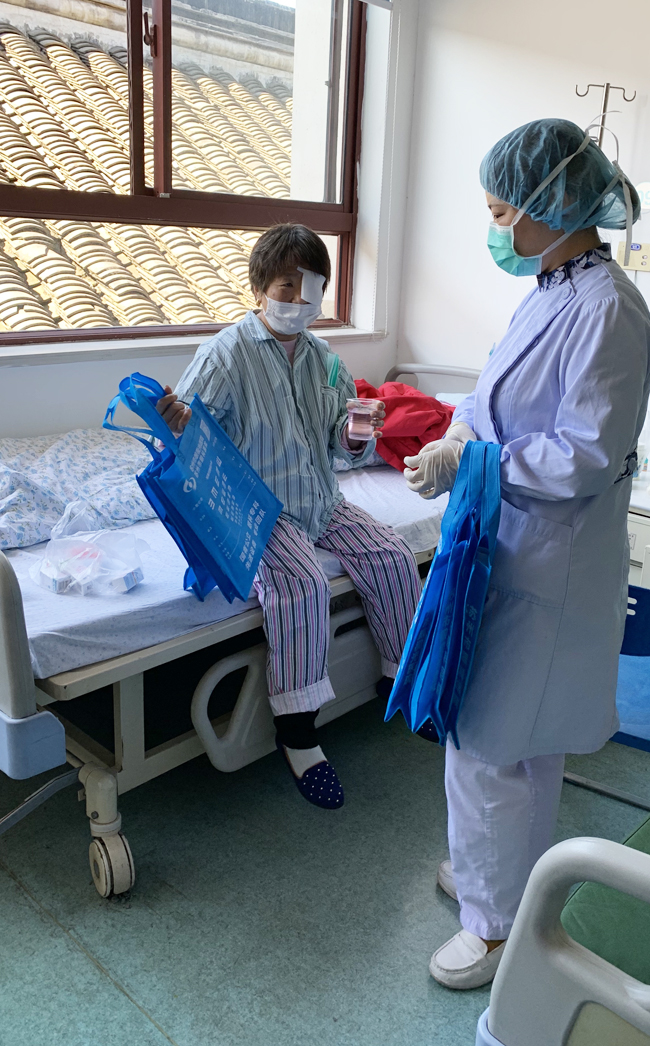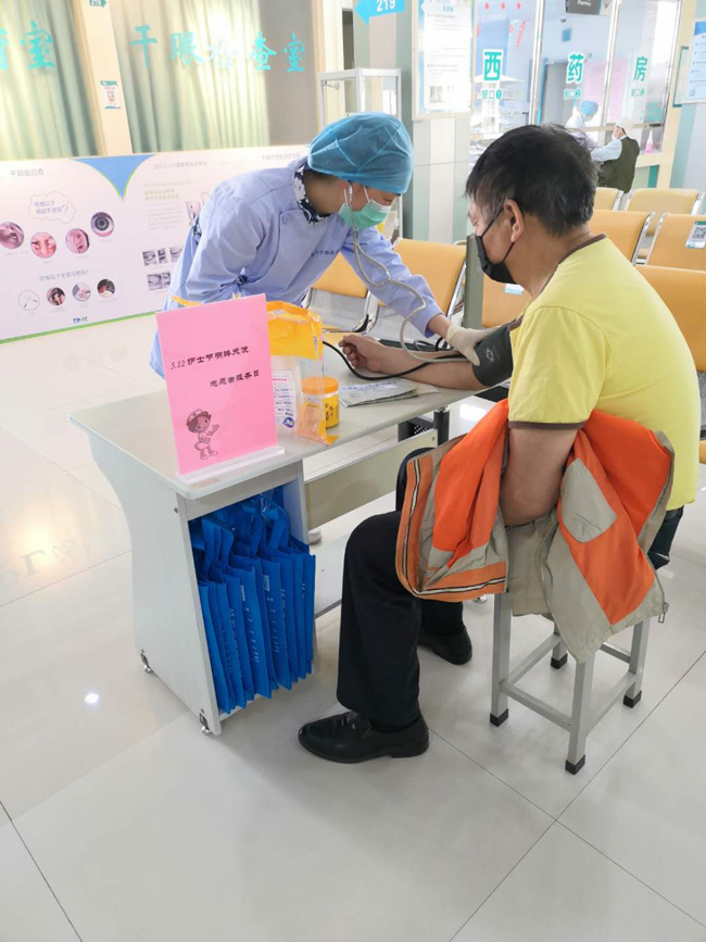 在醫(yī)院一樓視光門診處,志愿者護士們?yōu)樾∨笥褌兙臏蕚淞艘暳Ρ矶Y品袋,發(fā)放給每個來醫(yī)院檢查視力的小朋友,囑咐他們關愛自己的眼健康;在二樓眼病門診大廳,護士們熱心為看診的患者和家屬免費測量血壓;在三樓病房,病區(qū)護士長帶領大家為每位住院患者及家屬送上清熱明目的菊花茶和清肝明目的枸杞茶,愿患者早日恢復光明。