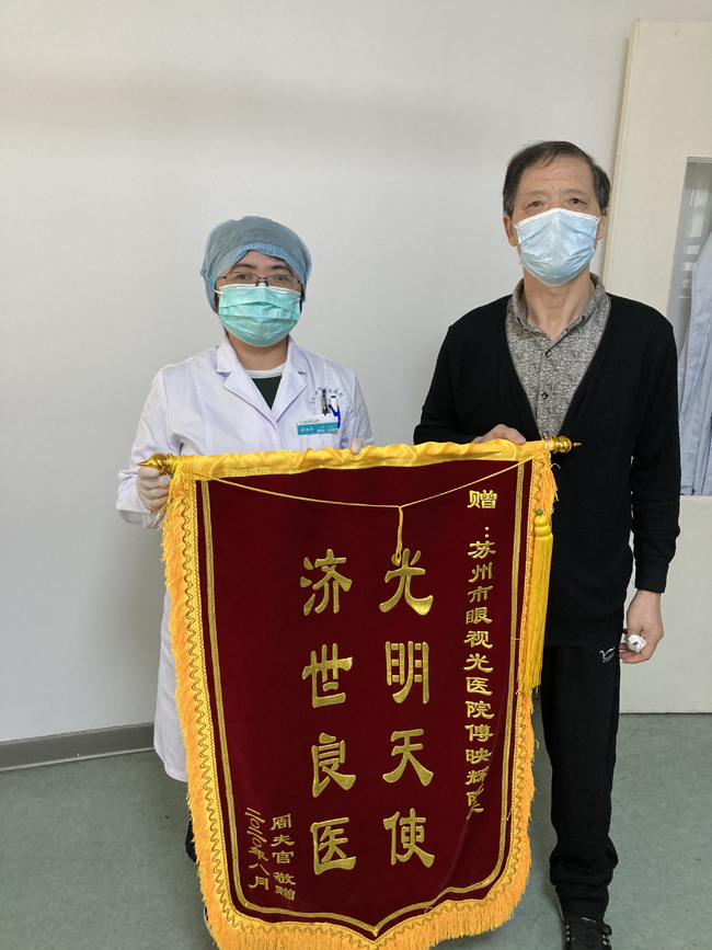 2020年9月24日,60多歲的周老伯如約來(lái)到蘇州市眼視光醫(yī)院二樓眼病診室進(jìn)行術(shù)后復(fù)查時(shí),帶來(lái)一面錦旗,他想通過(guò)贈(zèng)送錦旗的方式表達(dá)對(duì)傅映暉副院長(zhǎng)的感謝,感謝傅院長(zhǎng)幫他守住了最后的光明。