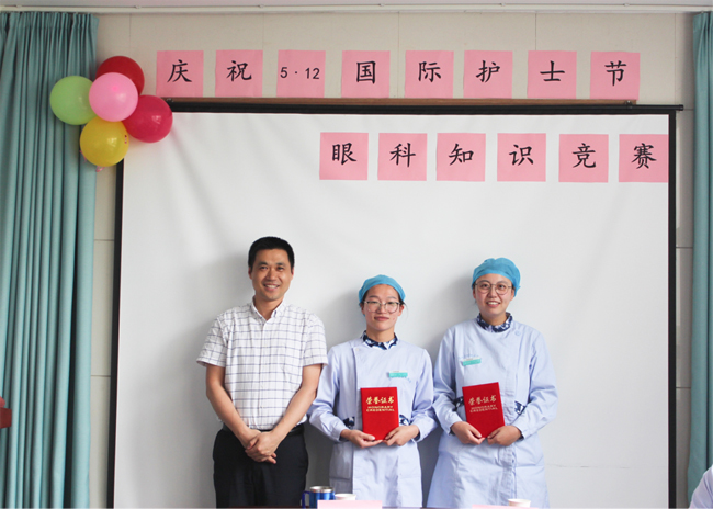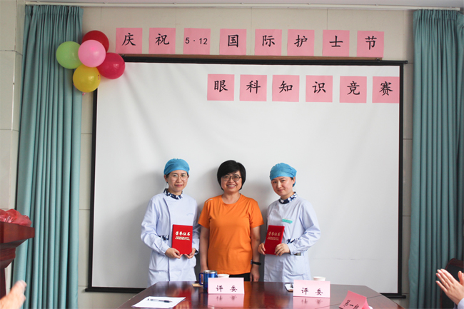眼科知識競賽分為兩個環(huán)節(jié),分為必答和搶答兩個部分,涉及內(nèi)容都是與臨床眼科相關(guān)的專業(yè)知識,護士共分五組參賽。必答題環(huán)節(jié)由肖書記做評委,各組按抽簽順序依次答題,此環(huán)節(jié)各組護士們旗鼓相當,不相上下。緊接著是緊張的搶答環(huán)節(jié),由傅院長做評委,護士們舉手搶答。最后任甜甜和宋文蓓組以總分140分拔得頭籌。