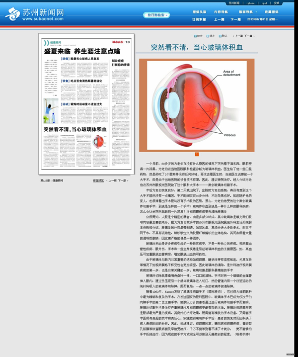 眾所周知,人眼是個(gè)精密的器官,由很多部分組成,其中玻璃體是填充我們眼球內(nèi)容最主要的成分。據(jù)為方老伯做手術(shù)的蘇州市眼視光醫(yī)院眼底外科主任鄭斌副主任醫(yī)師介紹,玻璃體的外觀晶瑩剔透,如同冰晶,其成分絕大多數(shù)是水,而又不同于水,不具有流動(dòng)性,組織學(xué)定義為膠原纖維編織的立體結(jié)構(gòu),其間點(diǎn)綴著大量的透明質(zhì)酸鈉,因此更嚴(yán)格的講是一種固體。