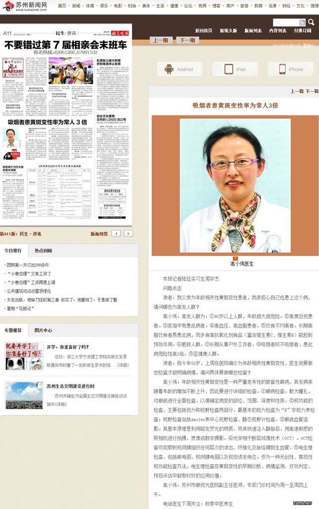 高小偉:年齡相關(guān)性黃斑變性是一種嚴(yán)重老年性的致盲性眼病,其發(fā)病率隨著年齡的增加不斷上升,因此要進(jìn)行詳細(xì)的檢查。①眼病檢查。散大瞳孔,對(duì)眼底進(jìn)行全面檢查,以便確定病變的部位、范圍、深度和性質(zhì)。②視功能的檢查,主要包括視力和視野檢查兩部分。最基本的視力檢查為“E”字視力表檢查;視野檢查包括Amsler表中心視野檢查、靜態(tài)視野計(jì)檢查。③眼底血管造影。其基本原理是利用能發(fā)熒光的物質(zhì),將其快速注入靜脈后,用高速敏感的照相機(jī)進(jìn)行拍攝、錄像或數(shù)字?jǐn)z影。④光學(xué)相干斷層成像技術(shù)(OCT)。OCT檢查可觀察到視網(wǎng)膜組織任何層次的滲出、纖維化及脈絡(luò)膜新生血管。⑤電生理檢查,包括眼電圖、視網(wǎng)膜電圖以及視覺誘發(fā)電位。作為一種無創(chuàng)性、客觀性視功能檢查方法,電生理檢查在黃斑變性的早期診斷、病情監(jiān)測(cè)、療效判定、預(yù)后評(píng)估中都有較好的應(yīng)用價(jià)值。