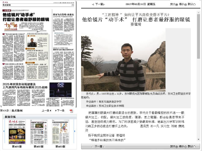 2009年從蘇州衛(wèi)生職業(yè)技術(shù)學(xué)院眼視光系畢業(yè)后,李代炎踏上了工作崗位,由于在校的優(yōu)異表現(xiàn),進(jìn)入蘇州衛(wèi)生職業(yè)技術(shù)學(xué)院附屬的眼視光醫(yī)院視光部磨鏡室工作。主要工作是為患者提供各類精密的眼鏡加工與維修調(diào)整服務(wù)。據(jù)了解,鏡片在加工制作的過程中,差之毫厘,都會給患者帶來不適,甚至造成視力損傷。鏡片旋轉(zhuǎn)角度上的誤差,行業(yè)術(shù)語稱之為“軸向誤差”,目前國家標(biāo)準(zhǔn)規(guī)定,一片合格的鏡片軸向誤差不能大于9度,但李代炎和同事們發(fā)現(xiàn),大于3度就已經(jīng)會對患者產(chǎn)生明顯影響?!凹热蝗绱?,那我們眼鏡驗配的執(zhí)行標(biāo)準(zhǔn)只能高于國家標(biāo)準(zhǔn),軸向誤差不能大于2度,只有這樣才能真正為患者提供一副舒適的眼鏡?!?br> 李代炎說:“我練習(xí)了將近一年,終于能把誤差控制到最小?!彼X得反復(fù)練習(xí)減少誤差就像士兵練習(xí)走正步一樣,重復(fù)勞動必然是枯燥的,但也正是因為不斷重復(fù)才能走的更整齊,精準(zhǔn)是枯燥的重復(fù)練習(xí)換來的。