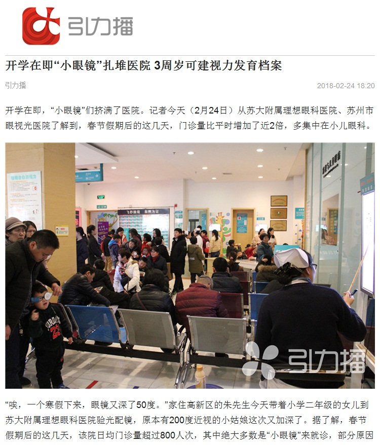 “唉,一個寒假下來,眼鏡又深了50度?!奔易「咝聟^(qū)的朱先生今天帶著小學(xué)二年級的女兒到蘇州市眼視光醫(yī)院驗光配鏡,原本有200度近視的小姑娘這次又加深了。據(jù)了解,春節(jié)假期后的這幾天,該院日均門診量超過800人次,其中絕大多數(shù)是“小眼鏡”來就診,部分原因為孩子寒假里無節(jié)制看電視、玩手機,造成視力下降。