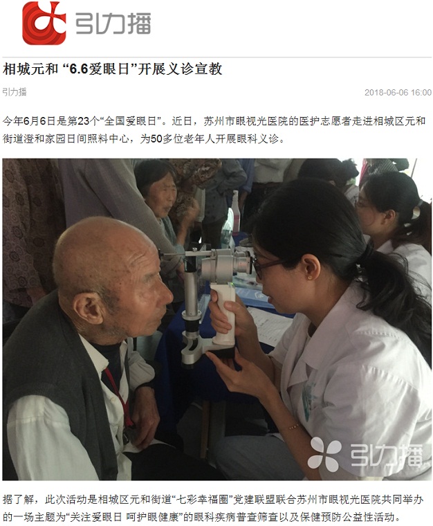 今年6月6日是第23個“全國愛眼日”。近日,蘇州市眼視光醫(yī)院的醫(yī)護(hù)志愿者走進(jìn)相城區(qū)元和街道澄和家園日間照料中心,為50多位老年人開展眼科義診。