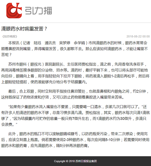 “如果有少量眼藥水流入嘴里也不要緊,只需要喝一口清水,多漱幾次口就可以了。”還有許多人怕滴進(jìn)的眼藥水不夠,總是習(xí)慣多滴幾滴。賈松指出,其實(shí),眼藥水每次只滴1滴就夠了,“因?yàn)榻Y(jié)膜囊內(nèi)可貯存的容量一般只有7微升左右,而1滴眼藥水約為30微升,多滴只會(huì)浪費(fèi)。”