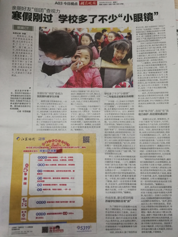 同時(shí),劉軍表示,除了改變作業(yè)形式之外,他們也鼓勵(lì)孩子參加戶外活動(dòng)。比如我校三年級(jí)的一個(gè)班“級(jí)就啟動(dòng)了‘全球?qū)ぴL祖國70年輝煌’螞蟻中隊(duì)雛鷹活動(dòng)。通過這些方式,在一定程度上使得孩子們遠(yuǎn)離電子產(chǎn)品,因而目前我校的近視人數(shù)沒有出現(xiàn)大規(guī)模的增長(zhǎng)?!?br> 蘇州工業(yè)園區(qū)外國語學(xué)校校醫(yī)王小梅告訴記者,他們每年都會(huì)為各年級(jí)的孩子進(jìn)行視力檢查,并將孩子的視力狀況記錄下來,形成一個(gè)專屬的視覺健康檔案。對(duì)于視力下降的孩子,班主任會(huì)主動(dòng)聯(lián)系學(xué)生家長(zhǎng),家長(zhǎng)得知情況后,會(huì)帶孩子到醫(yī)院進(jìn)行進(jìn)一步的視力檢查。