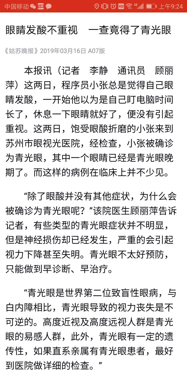 《姑蘇晚報(bào)》眼睛發(fā)酸不重視 一查竟得了青光眼
