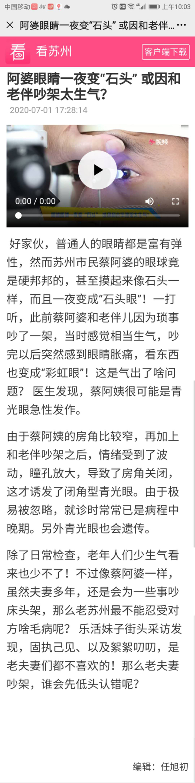 好家伙,普通人的眼睛都是富有彈性,然而蘇州市民蔡阿婆的眼球竟是硬邦邦的,甚至摸起來像石頭一樣,而且一夜變成“石頭眼”!一打聽,此前蔡阿婆和老伴兒因?yàn)楝嵤鲁沉艘患?,?dāng)時(shí)感覺相當(dāng)生氣,吵完以后突然感到眼睛脹痛,看東西也變成“彩虹眼”!這是氣出了啥問題?醫(yī)生發(fā)現(xiàn),蔡阿姨很可能是青光眼急性發(fā)作。