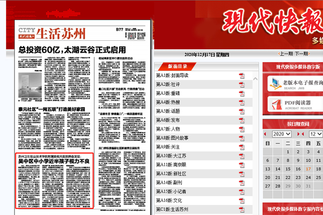 現(xiàn)代快報:蘇州衛(wèi)生職業(yè)技術(shù)學(xué)院附屬眼視光醫(yī)院篩查發(fā)現(xiàn):吳中區(qū)中小學(xué)近半孩子視力不良