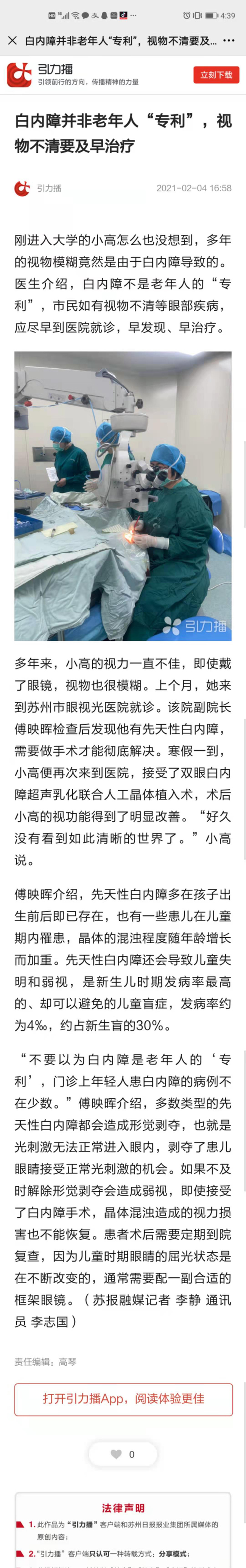 多年來,小高的視力一直不佳,即使戴了眼鏡,視物也很模糊。上個(gè)月,她來到蘇州市眼視光醫(yī)院就診。該院副院長傅映暉檢查后發(fā)現(xiàn)他有先天性白內(nèi)障,需要做手術(shù)才能徹底解決。寒假一到,小高便再次來到醫(yī)院,接受了雙眼白內(nèi)障超聲乳化聯(lián)合人工晶體植入術(shù),術(shù)后小高的視功能得到了明顯改善?!昂镁脹]有看到如此清晰的世界了?!毙「哒f。