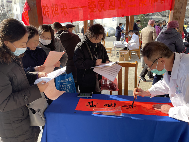 活動現(xiàn)場,眼視光醫(yī)院公益服務(wù)團(tuán)隊(duì)組成了一道獨(dú)特的風(fēng)景線,我院醫(yī)務(wù)部副主任吳作志醫(yī)生為社區(qū)老人們提供眼科健康檢查和咨詢,他為社區(qū)老人們解答眼部相關(guān)的問題,并向老人們宣傳眼科保健知識。我院黨員同志王禮明作為寫春聯(lián)的志愿者,揮毫潑墨,將對社區(qū)居民們最美好的祝福融入一幅幅現(xiàn)場書寫的春聯(lián)中。