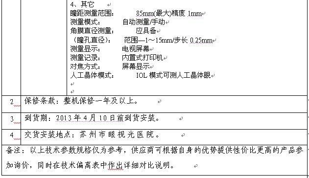 (一)報價方式:CIP(到院價,含材料費、配件費、安裝費、運輸費、稅費等與之相關(guān)的一切費用)?! ?br>(二)安裝要求:按原廠原裝標(biāo)準(zhǔn)驗收;如產(chǎn)品不符合需方要求,一個月內(nèi)提出異議,成交商及時進行退換貨處理?! ?br>(三)報價商應(yīng)免費提供該設(shè)備的產(chǎn)品性能介紹,使用操作、維護維修等培訓(xùn)服務(wù)?! ?br>(四)供貨時間:2013年4月10日前安裝到貨。