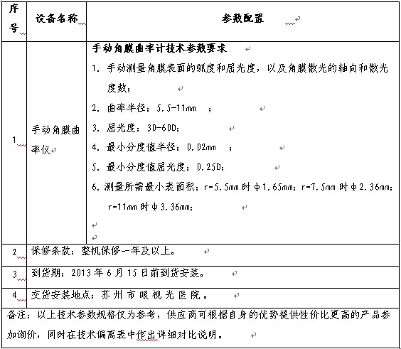 蘇州市眼視光醫(yī)院擬采購手動(dòng)角膜曲率儀一臺(tái),參照《中華人民共和國政府采購法》等有關(guān)規(guī)定,現(xiàn)特向社會(huì)公開詢價(jià)采購,歡迎具備獨(dú)立法人資格的相關(guān)單位前來報(bào)價(jià)?! ?br>一、采購編號(hào):SZEYE-2013005