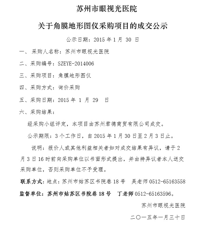 蘇州市眼視光醫(yī)院關(guān)于角膜地形圖儀采購項目的成交公示