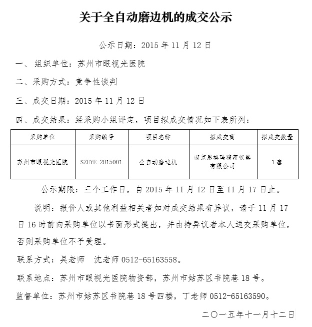 關(guān)于全自動(dòng)磨邊機(jī)的成交公示