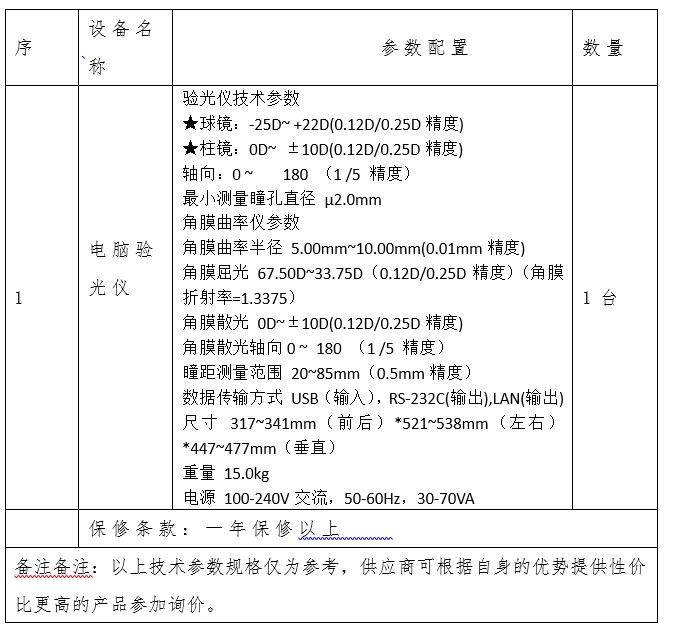 蘇州市眼視光醫(yī)院擬采購電腦驗(yàn)光儀一臺(tái),根據(jù)《中華人民共和國政府采購法》等有關(guān)規(guī)定,現(xiàn)特向社會(huì)公開詢價(jià)采購,歡迎具備獨(dú)立法人資格的相關(guān)單位前來報(bào)價(jià)?! ?br> 一、采購編號(hào):SZEYE-2019002
