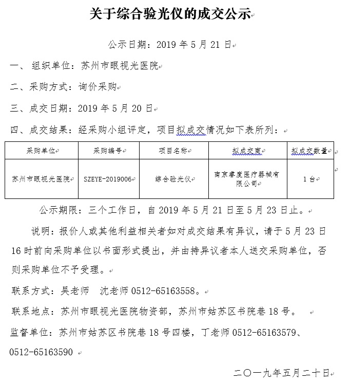 關(guān)于綜合驗(yàn)光儀的成交公示