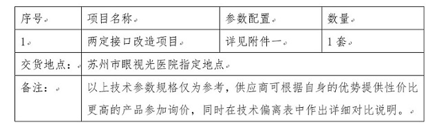 蘇州市眼視光醫(yī)院擬采購(gòu)兩定接口改造項(xiàng)目一套,參照《中華人民共和國(guó)政府采購(gòu)法》等有關(guān)規(guī)定,現(xiàn)特向社會(huì)公開(kāi)詢(xún)價(jià)采購(gòu),歡迎具備獨(dú)立法人資格的相關(guān)單位前來(lái)報(bào)價(jià)。